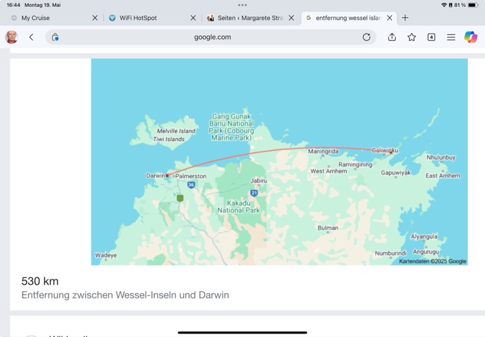 Erster Stop in Australien im Verwaltungszentrum der Torres-Strait-Islands. Hier leben ca 3000 Menschen. 91 Prozent sind Ureinwohner, die noch zu den Völkern Papua Neu Guineas gehören. Gesichtskontrolle an Bord und dann zu einem Empfang mit Musik der Mills Sisters – Die Chefin ist 98 Jahre alt – und einer Tanzgruppe der Highschool. Am Nachmittag Wanderung um die Insel. Laut Kapitän hatten wir unter dem Kiel noch 1 Meter Wasser.